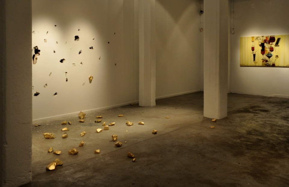 Para la realización de este mural, Bruno Juliano viajó desde Tucumán hasta Rosario con piedras extraídas del suelo tucumano recubiertas en láminas de oro. En el tercer piso del Macro, determinado el sitio donde se emplazaría su obra, inicia la acción de arrojar contra la pared las piedras, algunas de las cuales perforan la superficie, interviniendo de ese modo el espacio institucional.
