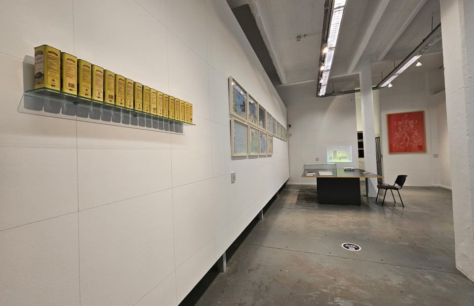 En la entrada del cuarto piso nos reciben Las ficciones de Borges de Horacio Zabala, es una hilera de latas de aceite de oliva cuya marca (Borges) termina contaminando la muestra completa. ¿Cómo desembarazarse durante el recorrido de un nombre tan absoluto? Casi compartiendo la línea de horizonte, aunque con cierto desfase, aparece la serie de mapas de Alfredo Londaibere. De los mapas pueden decirse muchas cosas: representan, presentan, construyen imaginarios, responden a impulsos cartográficos, geográficos, políticos e ideológicos, sin embargo, haber pasado antes