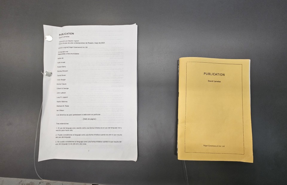 representación. Allí reside una de las principales problemáticas del ensayo. Por ejemplo, ¿el mimo del video de David Blandy presenta o representa? Al lado de los álbumes de Bainella, El inglés, también obra de Blandy, un fanzine cuyo nombre no puede dejar de remitir a Borges, por el idioma y por el personaje, una especie de cowboy que en Argentina se nombraba cuchillero. Para agregarle otra prueba, el ejemplar sobre la mesa es una traducción del inglés.