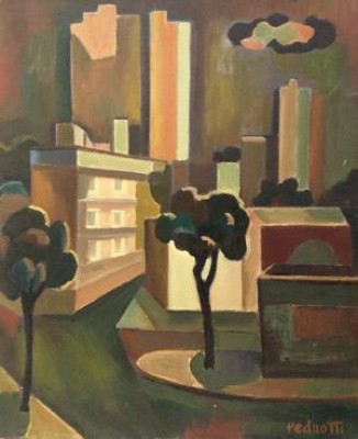 En los años 50 integró el Grupo Litoral, del cual fue miembro fundador, aunque tuvo una participación moderada hasta su disolución. En estos años Pedrotti fue despojando poco a poco su obra de lo sensible y fue otorgándole mayor racionalidad al sumarle una lógica interna: colores, planos y líneas construyen estructuras que sostienen la imagen. Tal es el caso de la obra que nos ocupa, que describe el barrio de la zona norte de Rosario.