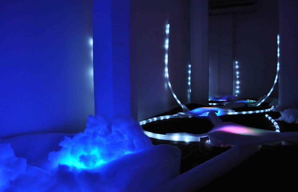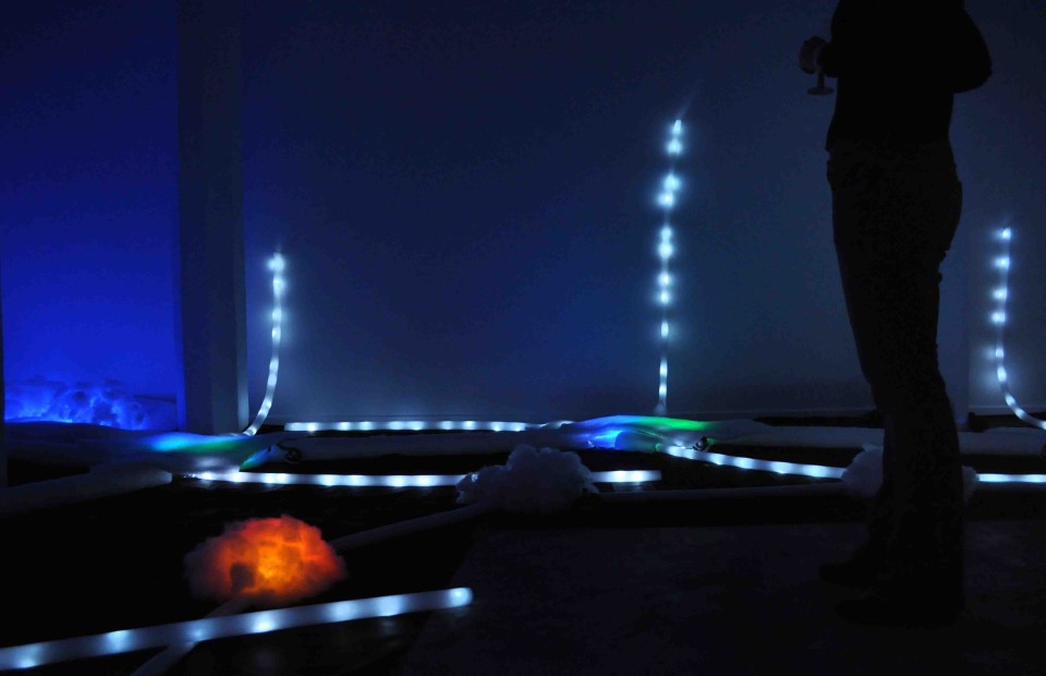 “Células es una obra interactiva, una búsqueda de un sistema funcionalmente orgánico a partir de la utilización de múltiples emisores, sensores, controladores y diversos dispositivos.