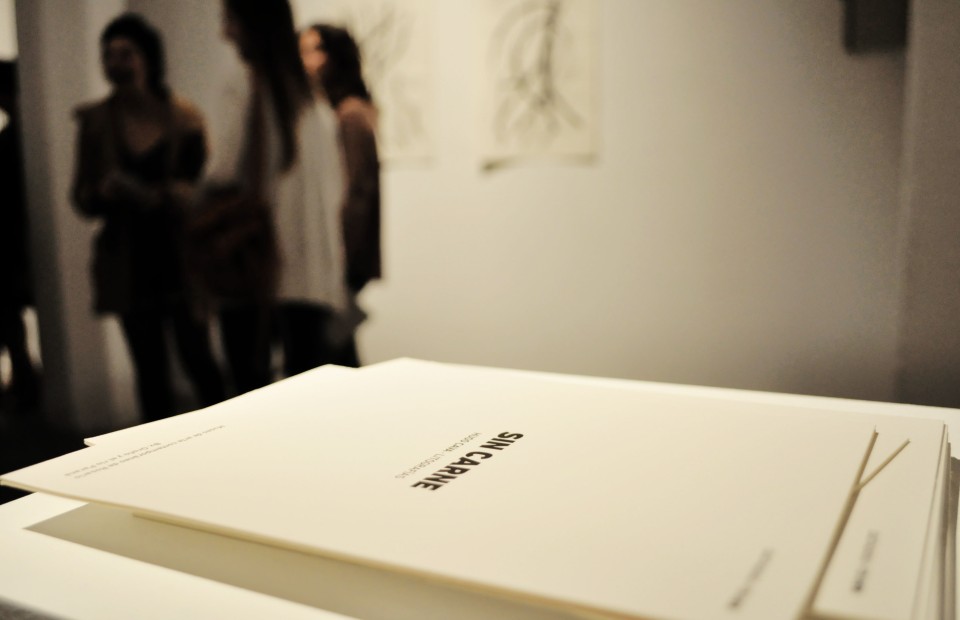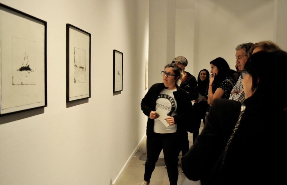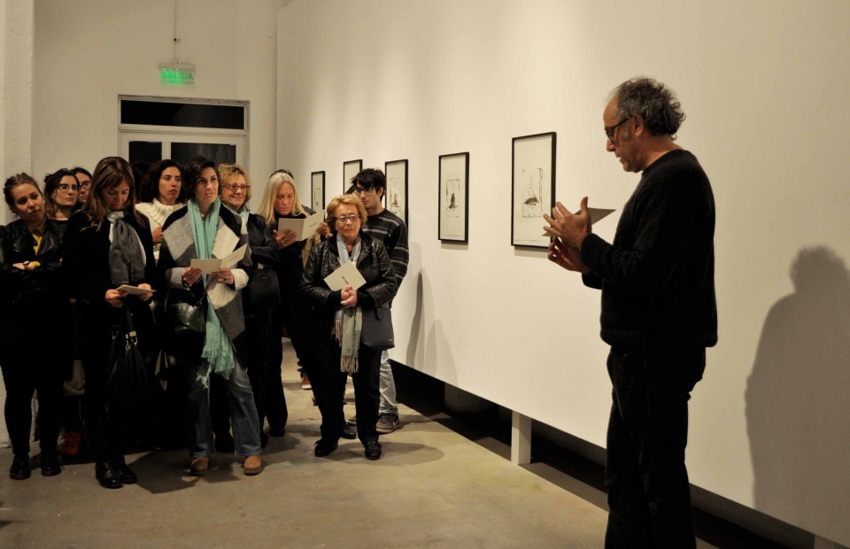 "El proceso es largo y lleno de cruces técnicos: dibujar, imprimir, fotocopiar, transferir y volver a imprimir. La imagen se deteriora en cada paso y, por suerte, se enriquece. Las piedras litográficas pesan, se frotan, se mojan, descansan, se presionan, se imprimen, se gastan. Hay una idea, parrillas, carbones, fuego, chispas, humo, tierra, ¿y la carne? Una patria de parrillas sin carne. Prender y apagar el fuego, imprimir y volver a imprimir, los rituales se van sumando. ¿Y la carne? El resultado: ocho litografías, dos offsets y un dibujo en la pared".