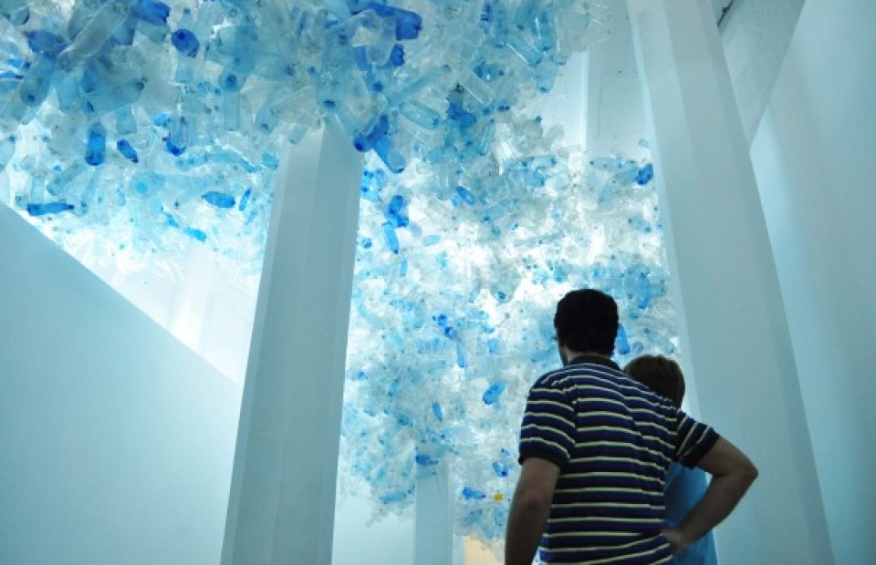 Instrucciones para realizar instalación site specific compuesta por botellas de agua mineral interconectadas con máscara de aire colgando de tubos plásticos