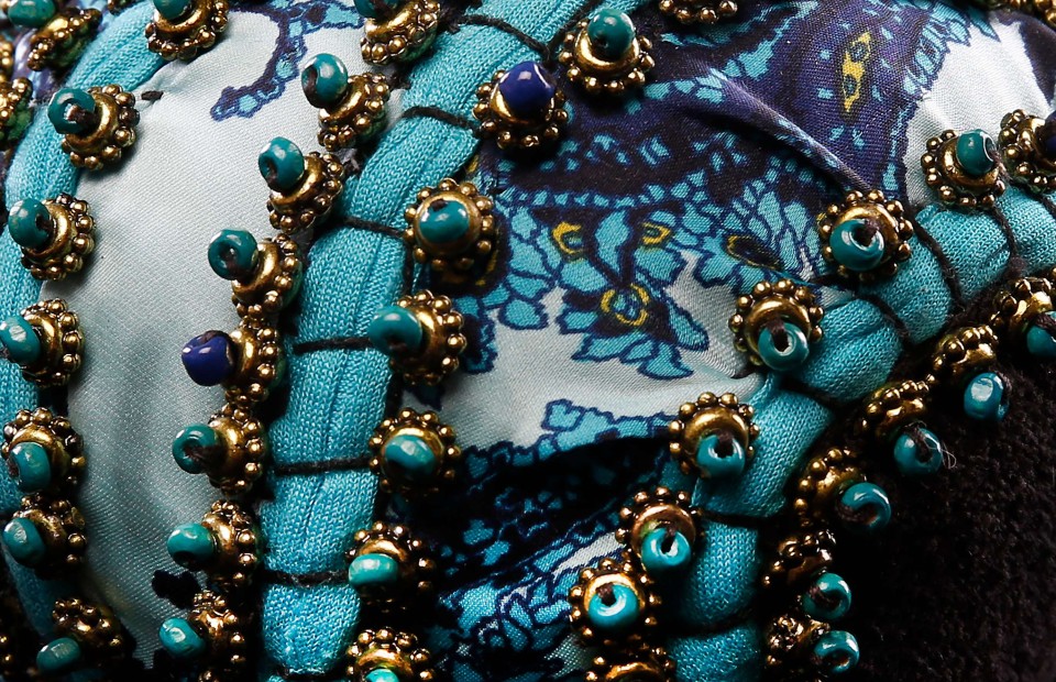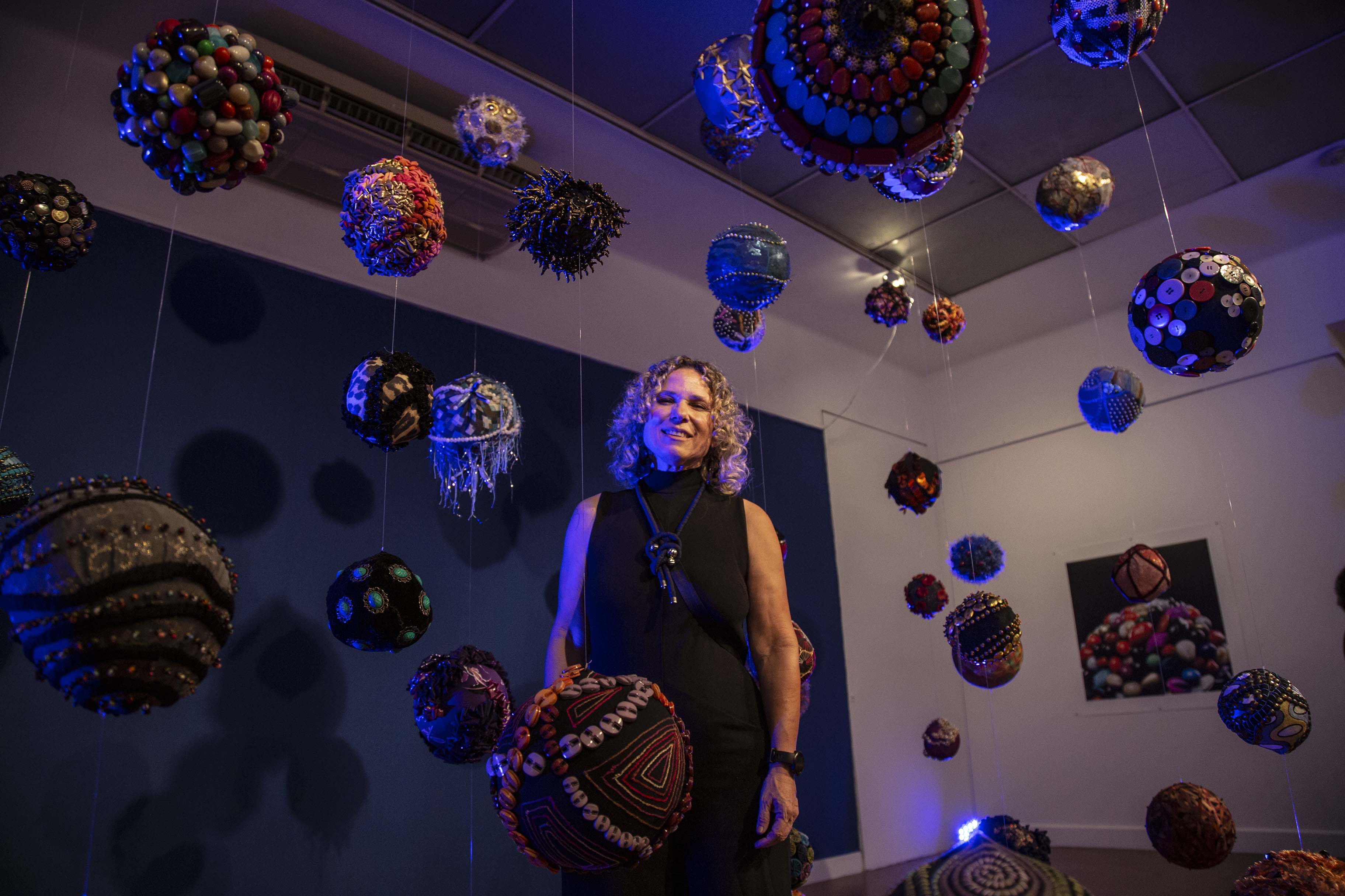 Marina Gryciuk es una artista que dialoga con las tradiciones textiles del pasado y el presente, oscilando entre el ámbito de la plástica y el de las expresiones populares para seguir pensando su historia desde la trama que condensa saberes y encuentros. Su obra se sostiene en la pasión por las telas, la costura y el vínculo con el cuerpo en una relación con tradiciones históricas que actualiza desde el quehacer contemporáneo a partir de múltiples estrategias. Objetos textiles que funcionan de manera autónoma y que pueden convertirse en accesorios vestimentarios, esferas de tela bordada con cuentas y pedrería que se desplazan sin prejuicios entre el campo del arte y la decoración son recursos que combina con registros audiovisuales y fotografías de autoría compartida con Gustavo Goñi en una sociedad creativa de larga data, fundada en intereses afines.