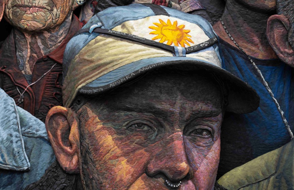 En 1934, Antonio Berni pinta sobre arpillera, Manifestación, una obra que capturó la dimensión social de su tiempo a través de un realismo nuevo y comprometido. Su mirada crítica y sensible lo consolidó como una de las figuras fundamentales del arte argentino y latinoamericano. Noventa años después, el colectivo Mondongo recoge esa herencia y la proyecta en el presente. Su Manifestación replica el formato de la pieza original, pero la revisita con materiales, símbolos y lenguajes propios de su universo creativo, trazando un puente entre dos tiempos, dos visiones, una misma preocupación por las problemáticas sociales.