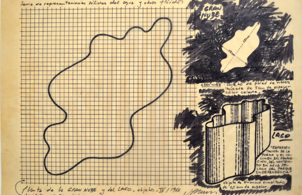 En el caso de la obra que se expone en el hall de ingreso al Museo Castagnino, Gran nube, objeto de pared de la serie De representaciones sólidas del agua y otros fluidos 1966/2009, es acompañada por la planta del mismo y un boceto en grafito, ambos realizados por el artista en 1984”, sostuvo Mariel Heiz, responsable del área de Registro y Documentación.