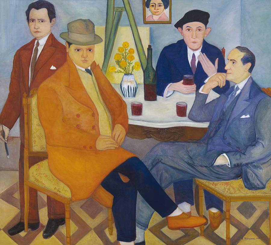 Fechada en 1930, Schiavoni representa de izquierda a derecha, a los artistas y amigos Manuel Musto, a sí mismo, José de Bikandi y Alfredo Guido. El lenguaje plástico de Schiavoni se halla en su etapa más característica, en la que todas las enseñanzas traídas desde Florencia han decantado en un programa estético sostenido en la síntesis: síntesis en el manejo conceptual del espacio, en el uso del color, en el dibujo. Los planos horizontales (la mesa y el piso) aparecen rebatidos y en las sillas, usa perspectiva caballera según la enseñanza de los primitivos toscanos. Se aleja de los colores locales, usando el color para componer (no olvida lo que aprendió junto a Costetti sobre el "sentimento de la tavolozza") a la par de la línea que bordea y delimita cada figura, sosteniendo el equilibrio de la imagen. No olvida que se trata de un retrato colectivo y evoca semejanzas, presencias que pertenecen a su mundo real. La pintura de Schiavoni ya es independiente de la realidad, concilia la exigencia de particularidad del modelo con la exigencia de generalidad de una pintura que quiere ser ejemplo de un nuevo estilo, acorde a las búsquedas de los novecentistas italianos. Schiavoni utiliza para componer un modelo picassiano: el boceto para el cartel Els quatre cats de 1905. No será la primera vez que Schiavoni cita a Picasso en su pintura. Si bien han sido obviados algunos personajes, el artista rosarino mantiene el personaje de la izquierda, que abre la composición, al cual le acentúa la diagonal con la pierna cruzada; adelanta el personaje que cierra la composición a la derecha sustituyendo el perro, mantiene el personaje de frente en el segundo plano y se incluye atrás a la izquierda, de pie, con pincel en mano y caballete. También mantiene el rebatimiento de la mesa, aunque moderado. La línea sinuosa y la curva, el ornamento en la composición de Picasso han sido también moderadas por Schiavoni, que ha estructurado de una manera mas rígida a sus personajes: los ha construido pictóricamente. En "Los pintores amigos", Schiavoni asume la imagen como concepto: como explica Alfredo Guido, "desde las cosas tal cual se ven hacia las cosas tal cual son. [...] [y así] vemos suprimidas las leyes perspectívicas, en el piso de mosaicos, en el evitar el claroscuro para penetrar limpiamente en las formas y suplir el carácter y el color de los personajes por formas y colores de tendencia simbólica, de acuerdo a lo que él creía ver en cada uno de ellos"