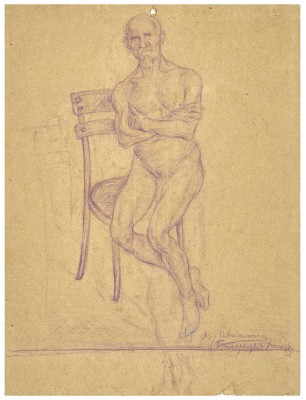 Ocho[4] de los grafitos, sepias y lápices de Schiavoni en la colección del MMBAJBC son, así como sin título (1914, Reg. No. 2503), estudios de la mano izquierda del artista. Se conserva igualmente un boceto de su pie (Reg. No. 2509) y otro de su rodilla (Reg. 2503). Todos ellos, claros ejercicios de aprendizaje, no parecen sin embargo intentos tan formales como aquellos más claramente ligados a su etapa florentina. En algunos de estos últimos -donde el sujeto de la representación es siempre un hombre de edad avanzada- es evidente la insistencia en lograr un equilibrio y un encuadre convenientes, prestando especial atención a la anatomía de los cuerpos. A pesar del esmerado rigor con que se aplica, hay en estas figuras un cierto resultado incómodo que les brinda un interés mayor al que tendrían si solo fuesen precisos ejercicios académicos. Tal es el caso Dino (Florencia, 11 de julio de 1915). Este era seguramente el nombre del anciano que Schiavoni retrató frecuentemente durante aquel mes, empleando como soporte el reverso de sobres de envío postal[5], hecho que a su vez puede vincularse a la falta de recursos del artista, que Emilio Pettoruti narrara años más tarde en su autobiografía[6].